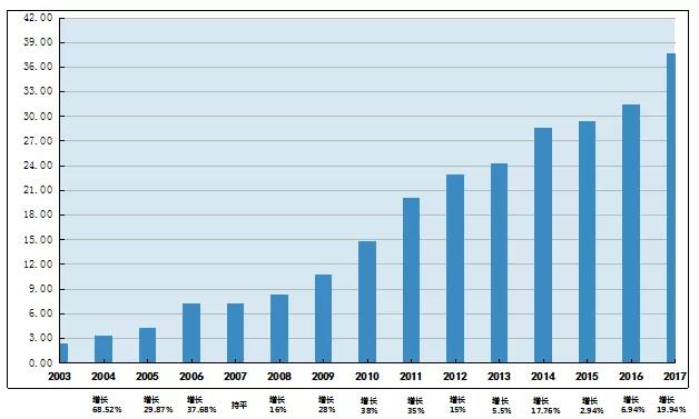 数据分析图一:《中科公司2003-2017年营业额数据图》(单位:亿元)